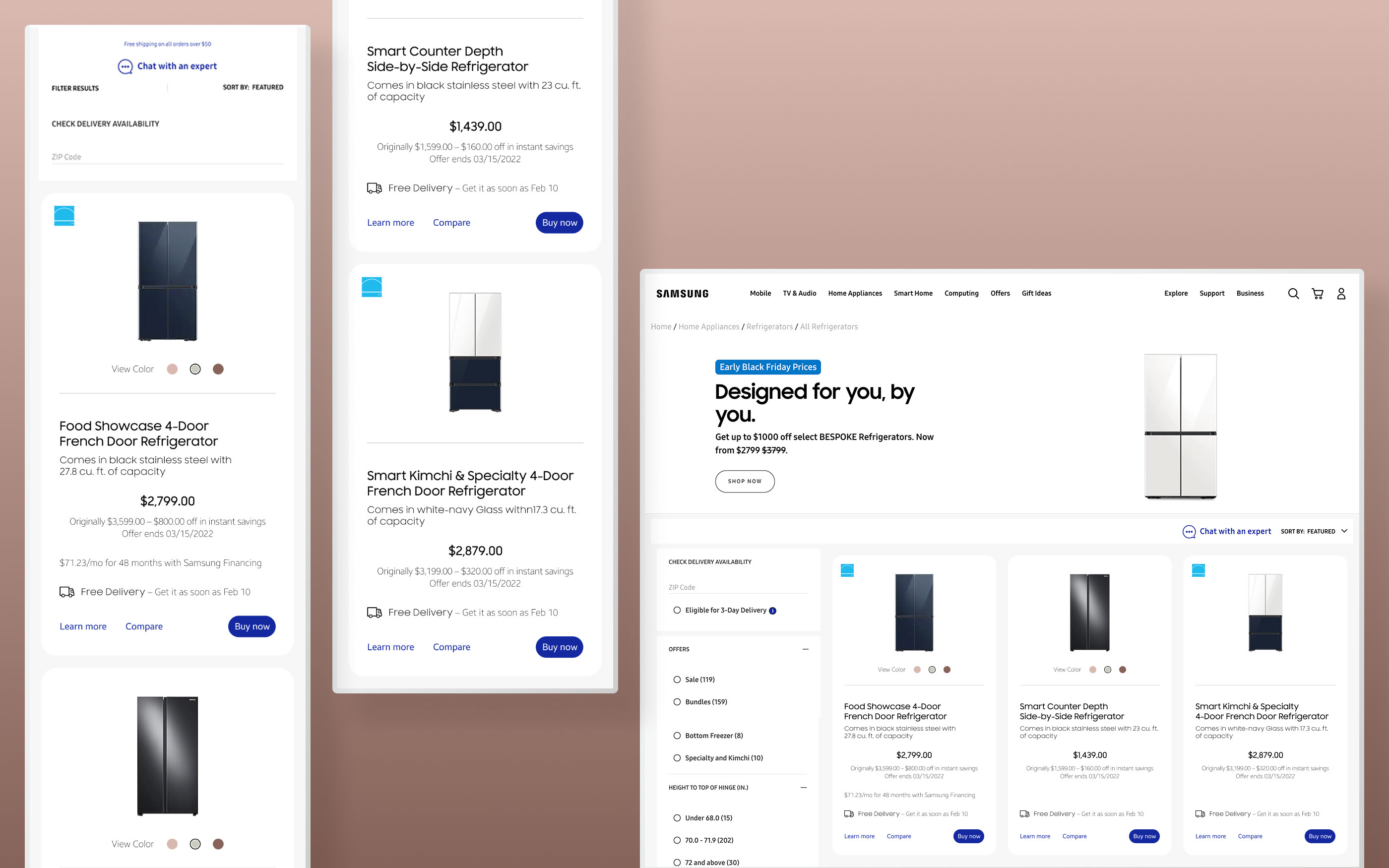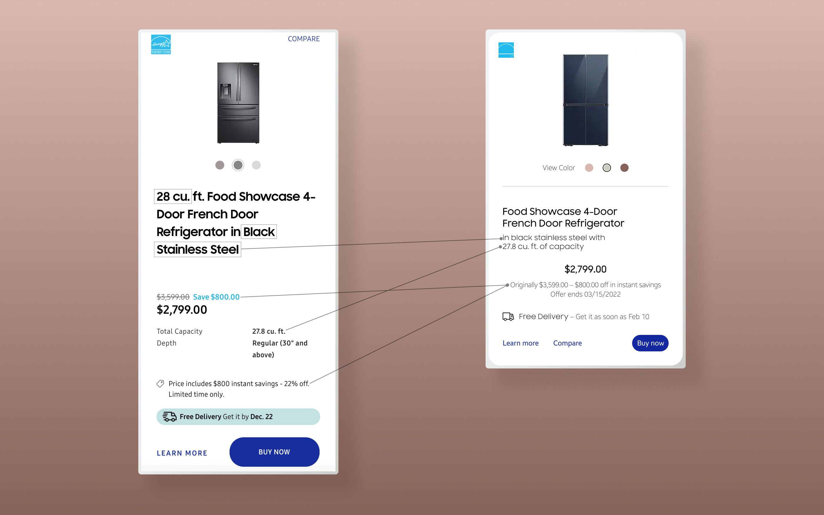 Was tasked with an audit and redesign of crucial PDP page product cards. The first change was adding a subhead block under the title to replace way-too-long titles (in home appliances). In addition, this new subhead section serves as a blurb to capture anything from specs to sales pitch. Trimmed pricing-related information, rewriting "save" to "savings", while removing meaningless percent discounts, plus confusing strike-thru and differently colored price savings info. Finally, anything clickable gets placed at the bottom of the card, no exceptions.