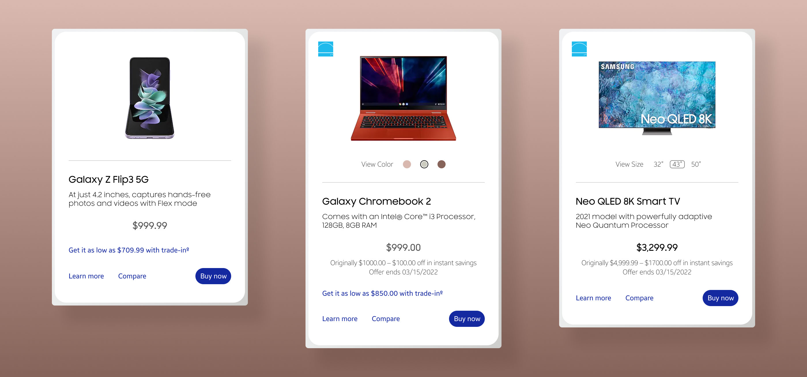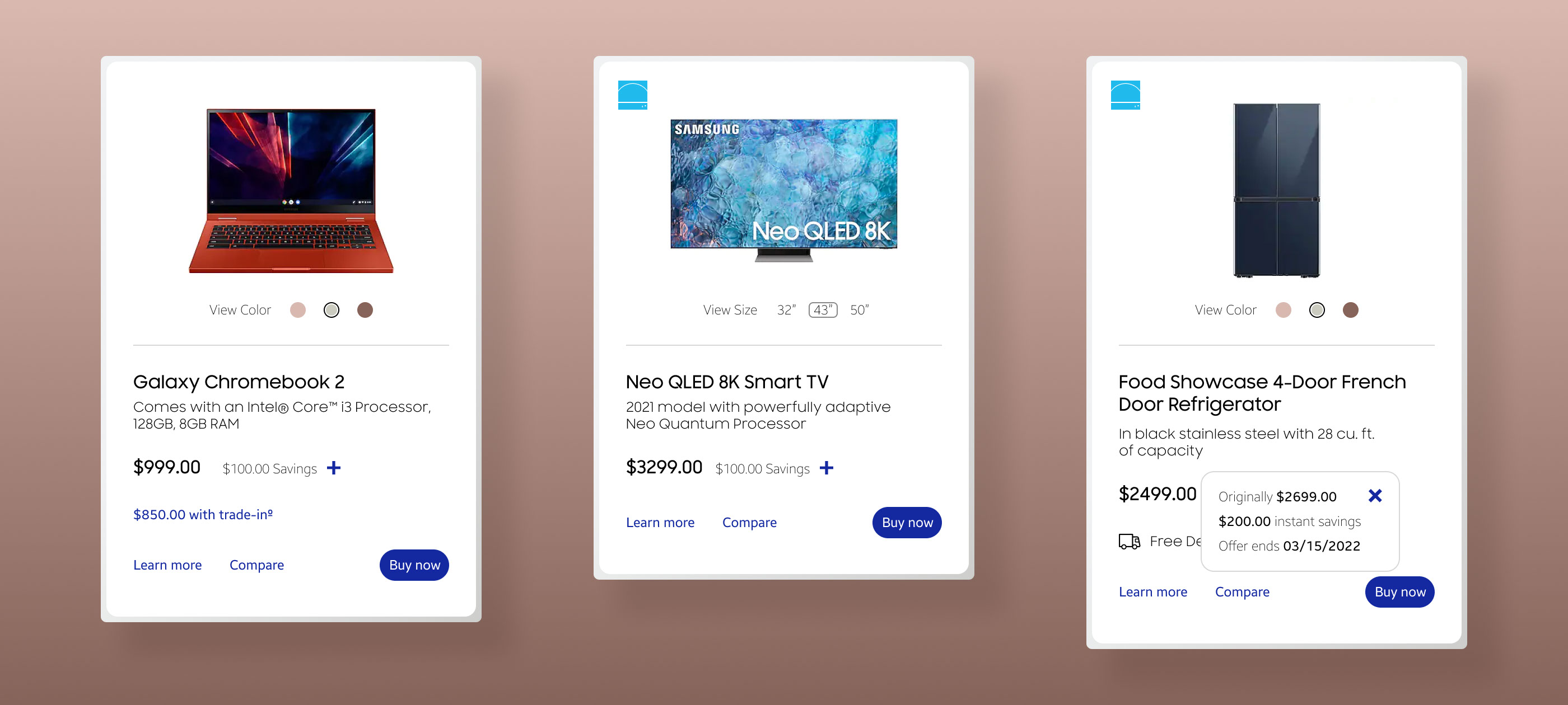 My initial recommendation was having everything left-justify, and then include a price savings tool tip. This not only freed up card real estate (much needed for home appliances), but further reduced user eye-strain. The final result was this modification above, which kept the prior product title and button size reductions (still sticking to ADA guides). For phone product cards, the initially left-justified price ("$999.99", as seen in the first card above) left an unsightly and odd white-space, thus had to center this section not only to resolve this issue but also, per marketing requirements, to add emphasis.